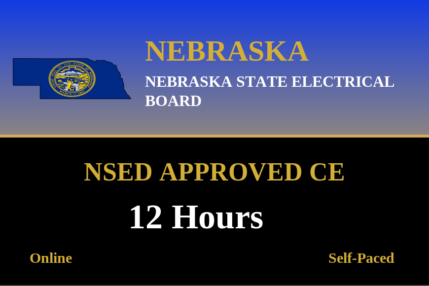 The Nebraska State Electrical Division requires licensed electricians to complete 12 hours of continuing education every two years to renew their license. At least six of these hours must be on the National Electrical Code (NEC).The remaining 6 hours can be on other approved electrical-related topics or studying the National Electrical Code. Get all 12 state-approved hours online at ExpertCE.com.